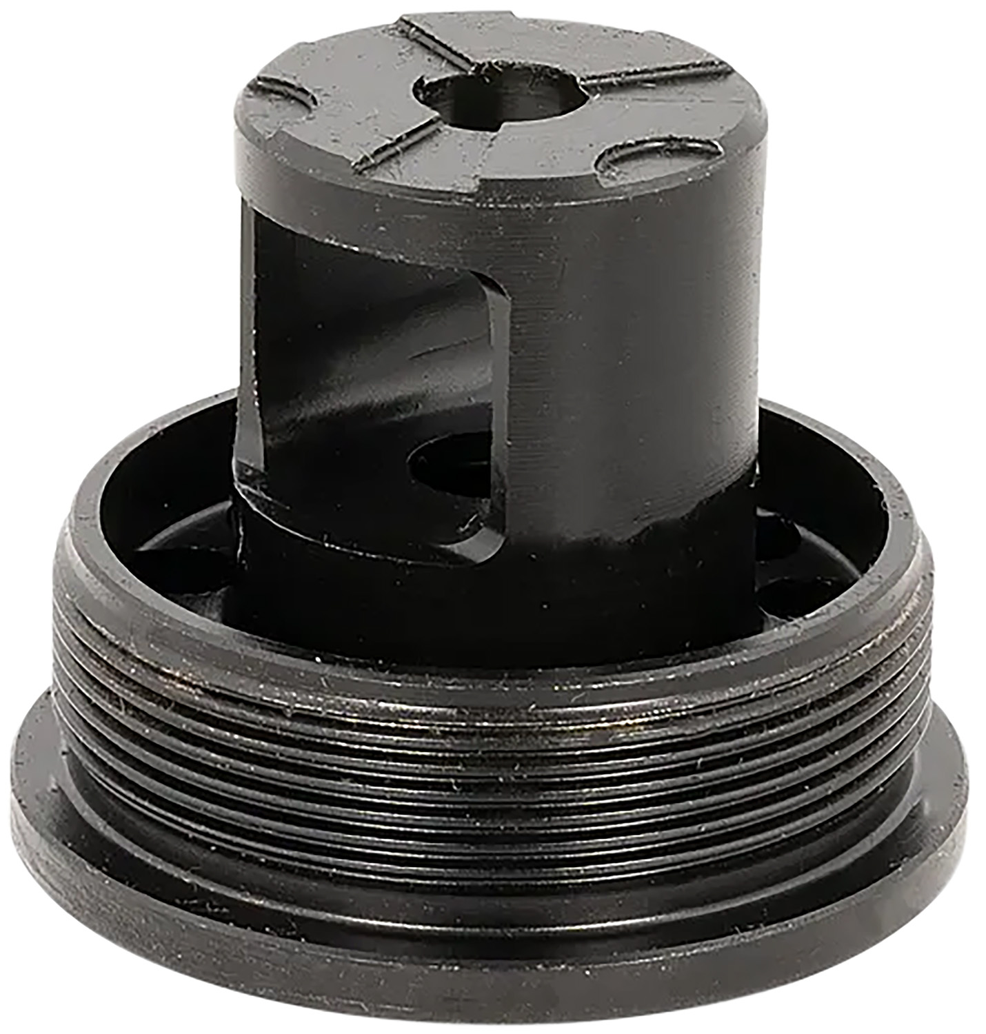 AAC Direct-Thread Adapters enable users of modular suppressors featuring industry-standard 1-3/8-24 threaded rear sockets to convert their suppressors to 5/8-24 direct-thread configurations. The AAC Direct-Thread Adapters are unobtrusive, low-profile designs that feature a muzzle-brake structure that divert gas and unconsumed propellant away from the projectile aperture and protects the blast chamber baffle from premature erosion. AAC Flange Indexing Direct-Thread Adapters feature a tool-featured flange with a square shoulder that indexes against the rear face of a host suppressor. Flange Indexing Direct-Thread Adapters should be compatible with most suppressors with industry-standard 1-3/8-24 threaded sockets.