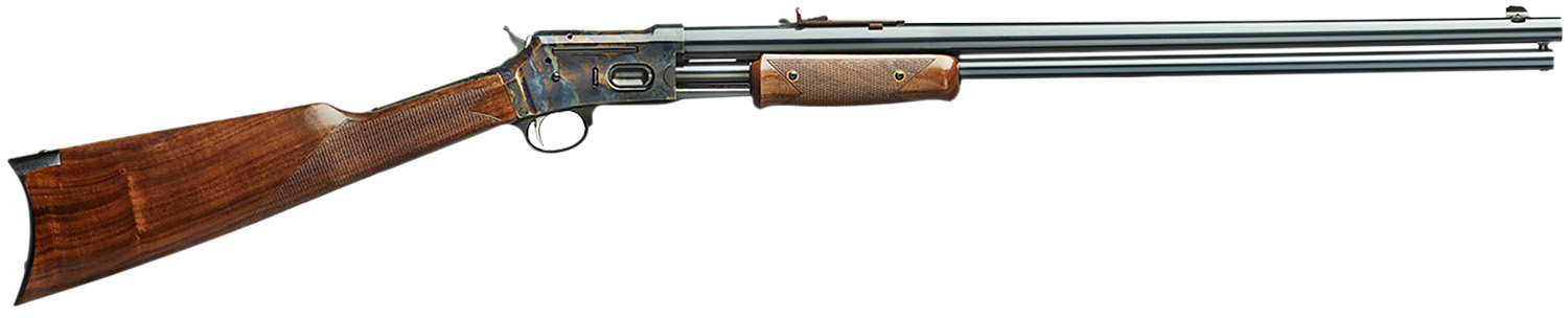 A Western Style pump action rifle chambered in .45 Colt. Featuring a blued barrel, case hardened receiver and a curved buttplate on a select walnut stock.