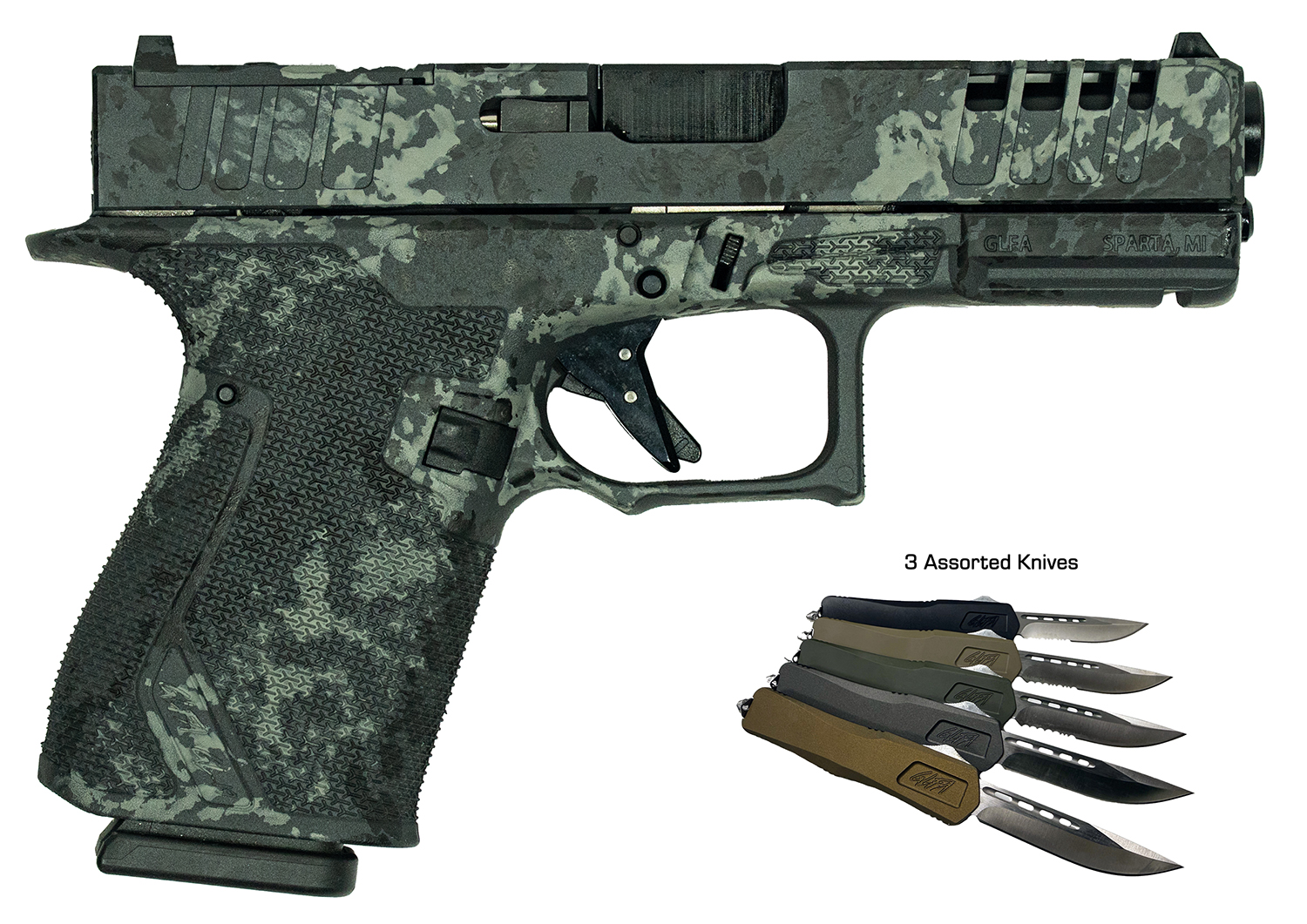 The Great Lakes GLFA 19 Striker 9mm compact features a polymer frame, optic ready RMR compatible ported slide w/front & rear slide serrations, compatible with Gen3 parts, ambi-magazine release, Cerakoted Bronze frame and 4″ barrel. Includes one 15rd Glock compatible magazine and three assorted SKU’s of Out The Front style knives that feature a 3.50″ D2 Steel blade and a 4.50″ 6061 Aluminum Grip. These come with glass breakers, belt clip and feature a premium Cerakote finish in these colors- Black, Tungsten, Bronze, FDE, and/or OD Green. They may be serrated or smooth blades.
