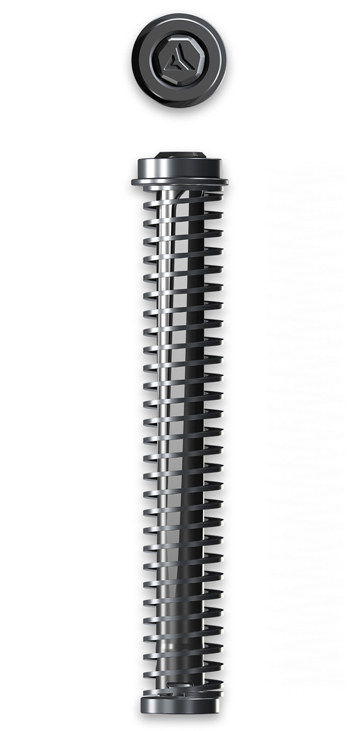 Screwless design of the Compressor Guide Rod. The dovetail interface is captured by the spring, creating a simple and secure lock-up. Flutes along the guide rod allow the spring to move with less friction for smoother cycling. The heat treated guide rod has a slick, durable and corrosion-resistant Nitride finish.