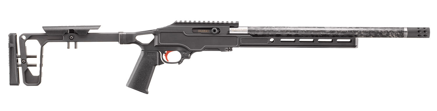 The 10/22 Competition features a grey birch chassis with a modular 10″ forend w/M-LOL and Arca-Swiss compatibility and ambidextrous QD points; stock is adjustable for length of pull and cheek height and folds for easy storage and transport; dual bedding system incorporates a second bedding lug, ensuring the receiver is securely bedded to the stock; cold hammer-forged barrel tensioned in carbon fiber sleeve features a 1/2″-28 threaded muzzle and is fitted with a thread cap which can be removed to allow for the use of muzzle accessories; cross-bolt manual safety; integral, optics-ready 30 MOA picatinny rail; the receiver and stock combine to create classic lines for attractive styling. Includes hard case; Ruger custom shop certificate of authenticity, challenge coin, cleaning cloth and decal.