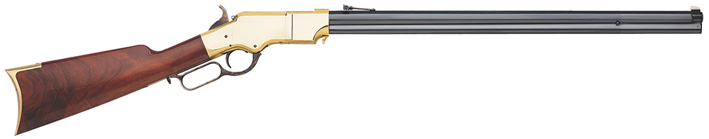 Taylors and Company’s 1860 Henry Lever Action features a 24-1/4″ Octagonal Tapered Blue Barrel with brass frame and butt plate. The “Henry”, named after its inventor, is the first repeating rifle in history. With it, one man could load 15 cartridges in eight to ten seconds. It was such an important innovation that it was the equivalent as 15 men armed with tradtional firearms. This model features a 24.25″ tapered octagon blued barrel, forged brass frame and brass butt plate. The barrel has an integrated magazine tube with a 13-round capacity, a rear ladder sight and a blade front sight. It has a beautiful walnut stock for a total length of 43.75″.
