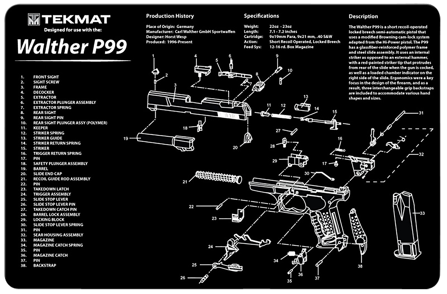 Be the first to review “TekMat TEKR17WALP99 Walther P99 Cleaning Mat Black/White Rubber 11″x17″ Walther P99 Parts Diagram” Cancel reply